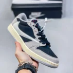 اللون الرمادي الداكن يلتقي مع تفاصيل الأسود الجذاب في مزيج متناغم، بينما تضفي اللمسات الجلدية الفاخرة على الحذاء لمسة من الفخامة والمرونة. كما يتميز الحذاء بشعار ترافيس سكوت المميز على الجهة الجانبية، مما يعزز من هوية الحذاء ويجعله قطعة فنية بحد ذاته.